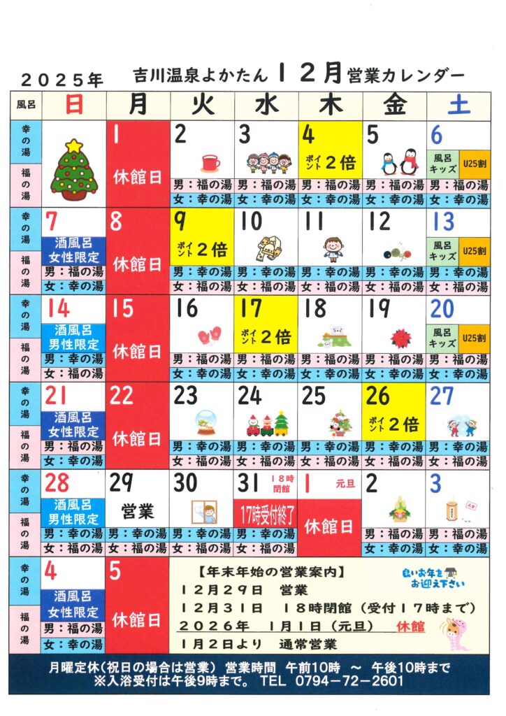 吉川温泉よかたん 令和7年12月営業カレンダー