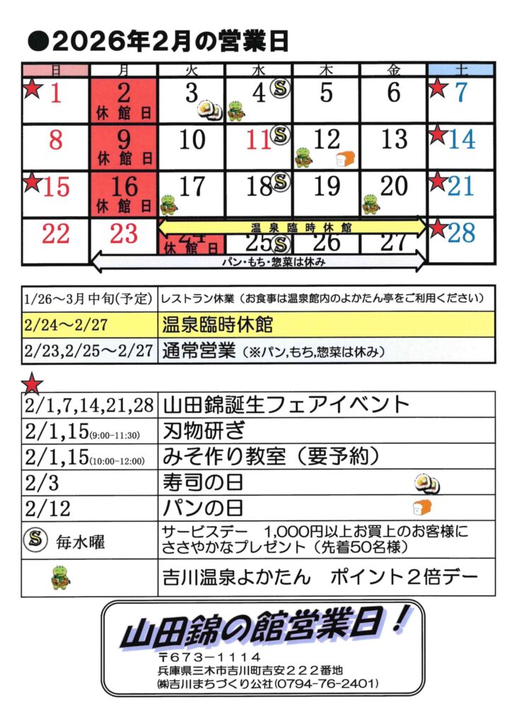 山田錦の館2月営業カレンダー