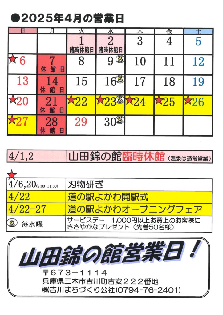 吉川温泉よかたん 令和7年12月営業カレンダー
