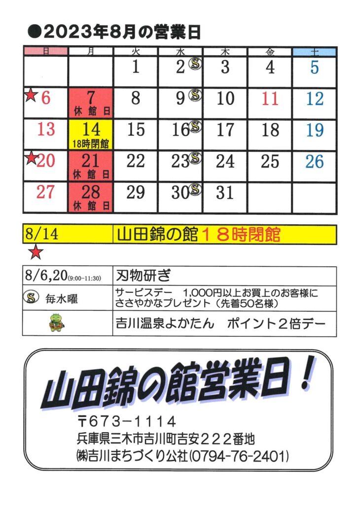 8月営業日カレンダー