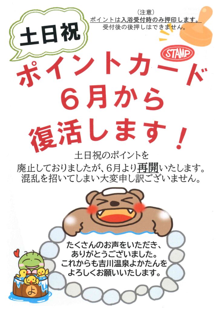 吉川温泉よかたん「土日祝」のポイント付与(大浴場入浴)再開します。