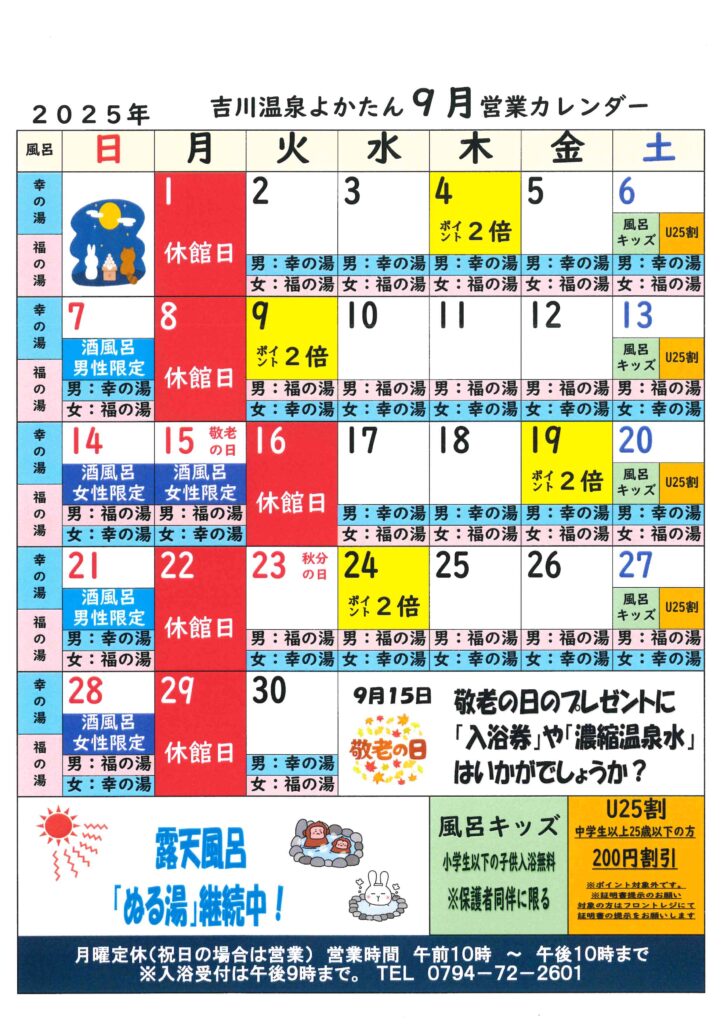 吉川温泉よかたん 令和7年9月営業カレンダー