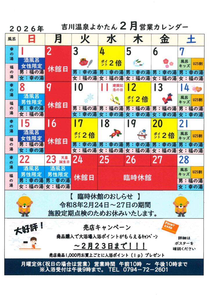 吉川温泉よかたん令和8年2月営業カレンダー