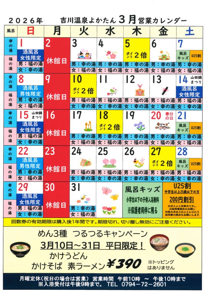吉川温泉よかたん 2月8日㈰ 臨時休館いたします。