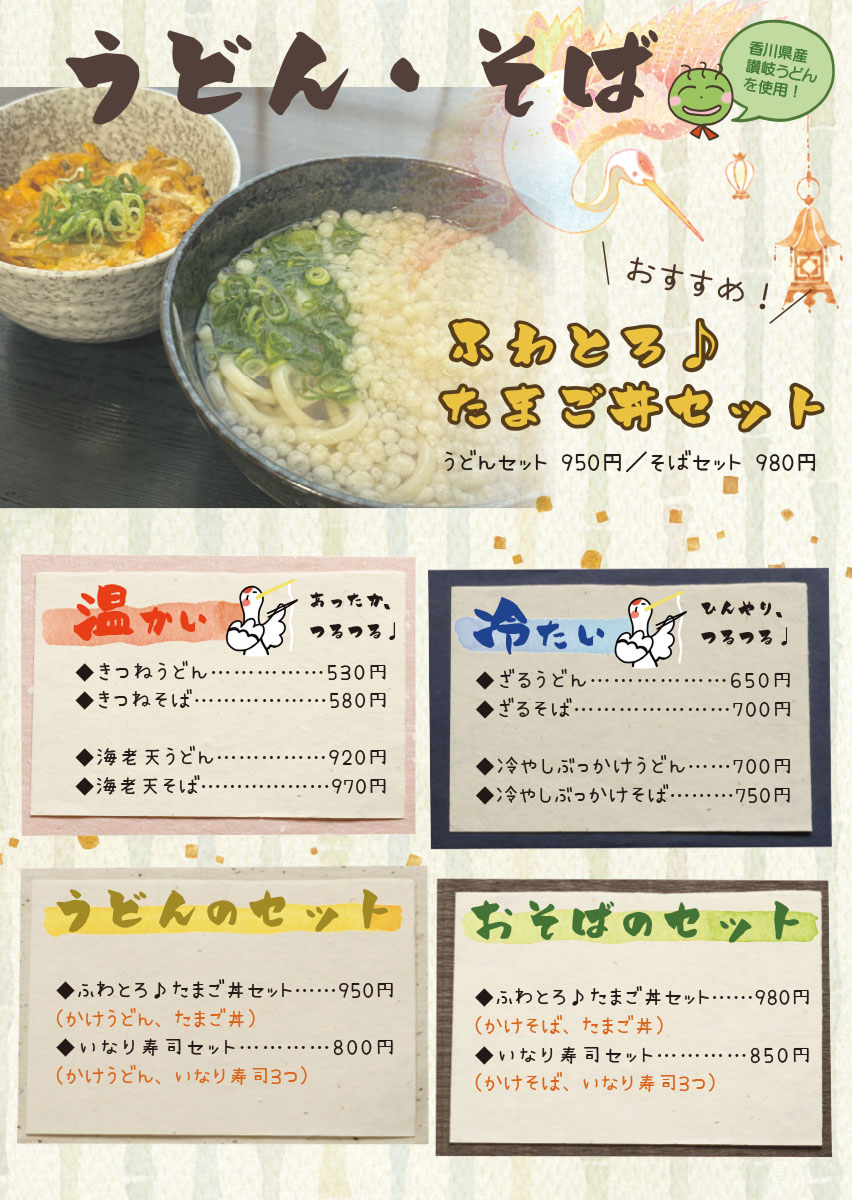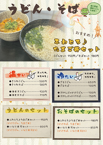 うどん・そば、定食などの定番メニューから、ここでしか味わえないご当地メニューまで、気軽に食べていただけるメニューを揃えています。